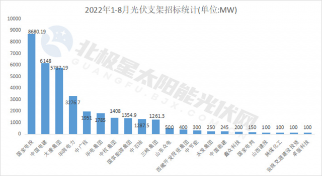 据北极星太阳能光伏网统计,今年1-8月,国内光伏电站开发企业支架招标规模超35。5GW,国家电投(8。68GW)、中国电建(6。15GW)、大唐集团(5。74GW)招标量居前;民营企业也逐渐入场,支架招标容量达800MW。