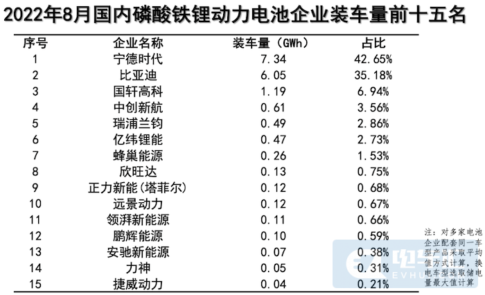 电车汇消息:近日,动力电池产业创新联盟发布的8月动力电池月度数据显示,8月磷酸铁锂电池装车量企业排行榜中,宁德时代位列第一,装车量为7.34GWh,占比为42.65%。比亚迪装车量则为6.05GWh,占比35.18%。