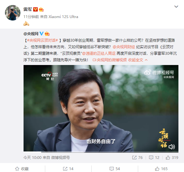继俞敏洪后,央视网财经纪实访谈节目《云顶对话》迎来第二期,此次的主角时小米董事长雷军。