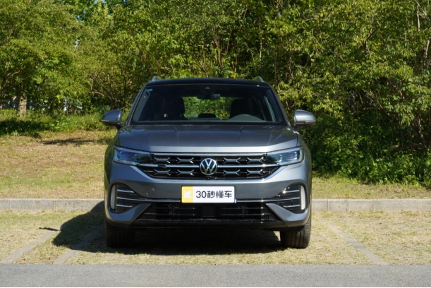 今天所体验的是2023款 380TSI 四驱R-Line Pro智慧版车型。全新探岳在格栅部分做出了调整,命名为“X 峰峦式前格栅”。会发光的品牌LOGO,天弓贯穿式格栅氛围灯的搭配很有科技感。前大灯搭载了IQ。 Light 技术,采用LED光源,夜间铺路效果出色。