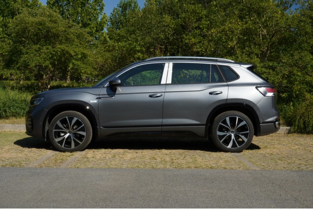 探岳的侧面非常饱满,前门板R-Line车身标识设计的,配合下方灯带,视觉效果出色。全新探岳采用了20 英寸轮辋,配合尺寸为235/45 R20邓禄普SPORT MAXX系列轮胎,属于同级别中上水平,带来不错的操控体验。