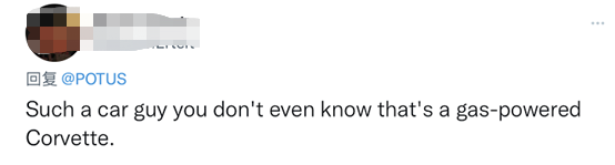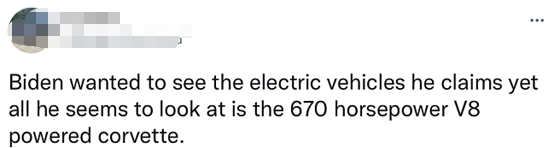 拜登的推文在网络上引发关注。有网友评论称:“拜登想看他所谓的电动车,但他看起来关注的是670马力V8引擎的科尔维特。”↓