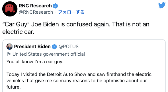 拜登这则推文也引来美国共和党的嘲讽,由共和党全国委员会(RNC)运营的推特账号“RNC”引用拜登推文评论称,“‘汽车迷’拜登又糊涂了。这不是辆电动车”。↓