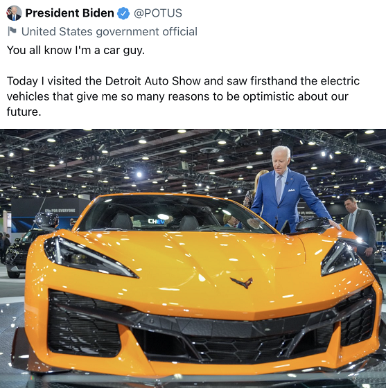 【环球网报道】综合美国《纽约邮报》、汽车杂志《Road and Track》当地时间15日报道,在参观完底特律车展后,拜登发推称,“你们都知道我是个汽车迷,今天我参观了底特律车展,亲眼看到了电动汽车,这给了我很多理由对我们的未来持乐观态度”,却配了一张自己与燃油车的照片。这则推文引来网民和共和党的嘲讽。