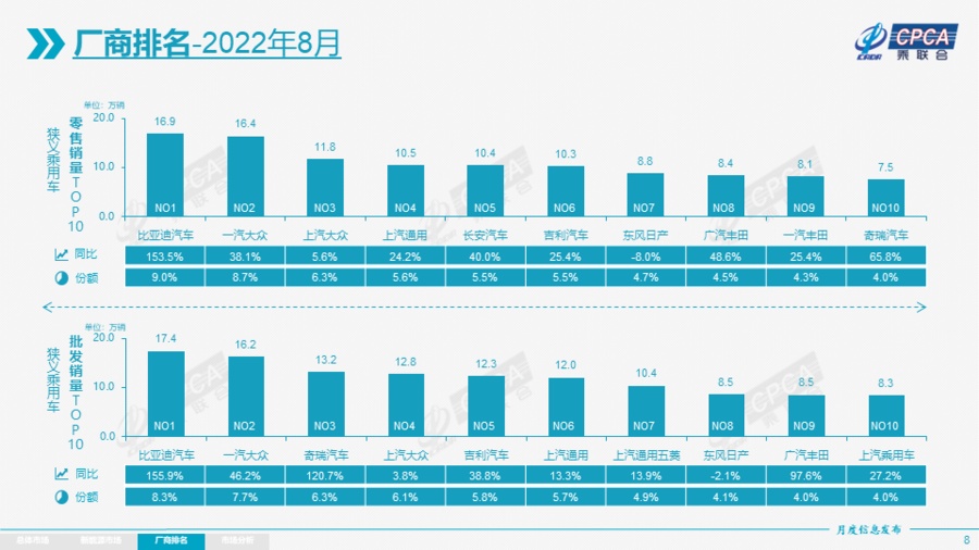 线月份国内的汽车销量,那真的是“风云榜”啊,总体市场零售、批发同比增长36。6%,比亚迪(002594)稳居厂商排名第一,新能源气势如虹零售销量同比增长111。2%。来吧,小伙伴们,一起来看看8月销量吧。