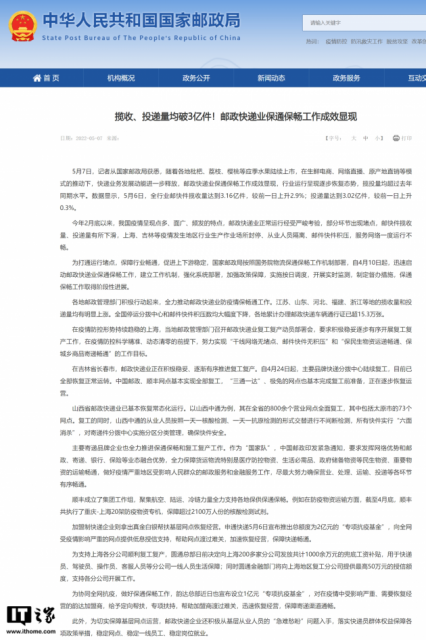 5 月 7 日消息,据国家邮政局网站,数据显示,5 月 6 日,全行业邮快件揽收量达到 3。16 亿件,较前一日上升 2。9%;投递量达到 3。02 亿件,较前一日上升 0。3%。