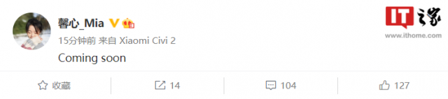今日,小米 Civi 产品经理胡馨心在社交平台上表示,小米 Civi 2 即将发布,并该机已经获得了微博机型认证。