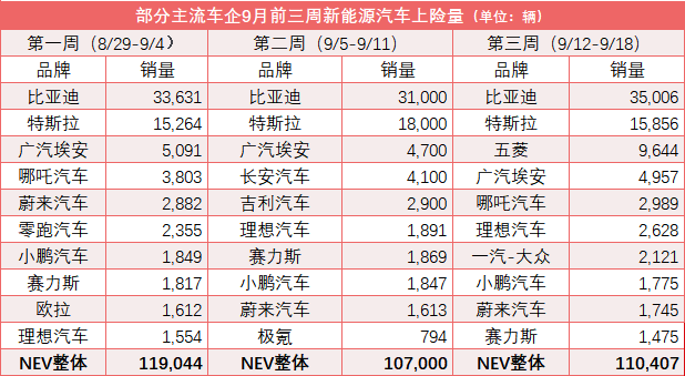 据相关上险数据显示,9月第一周(8月29日-9月4日)、第二周(9月5日-11日)和第三周(9月12日-18日),国内新能源汽车上险量分别为11。9万辆、10。7万辆和11万辆,三周累计上险量约33。65万辆。以此估算,9月国内新能源汽车的整体销量将超过50万辆。今年8月新能源乘用车上险量为48。21万辆,这意味着,9月新能源汽车将继续保持环比增长。