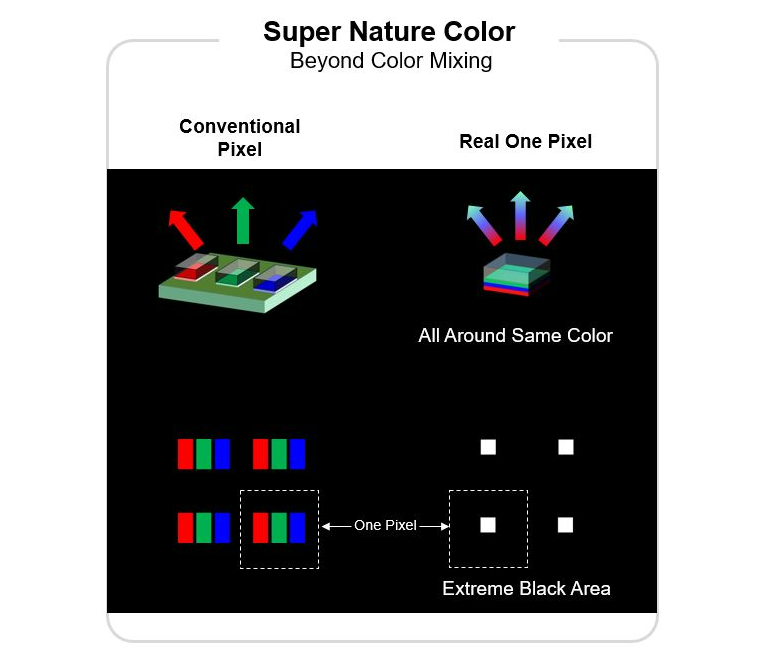 Seoul Viosys公司表示,他们使用一种成型技术来控制莫尔条纹(Moiré pattern)现象,并使用低反射技术来创造出深黑色形成高对比度,有助于在光线下浏览microLED显示屏。同时,从像素内部向外发射结合了R/G/B的颜色,因此无论从哪个方向看,都不会产生失真,可以欣赏到清晰的图像。
