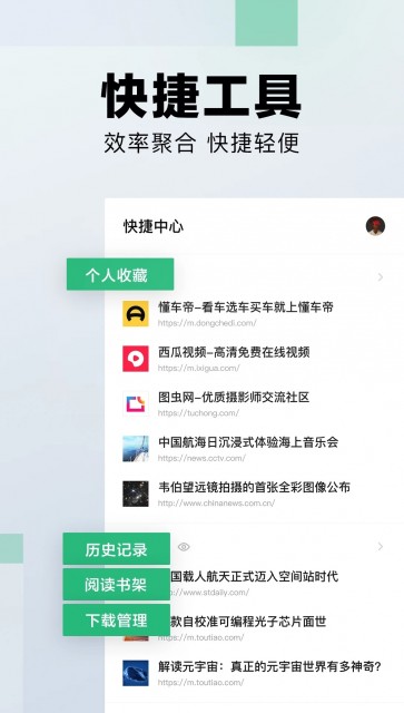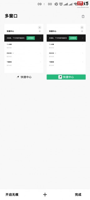 悟空搜索底部为导航栏,除了主页,还拥有左侧的快捷中心和右侧的多窗口功能。在快捷中心内,用户可以看到个人收藏、历史记录和下载内容,同时 App 会提醒用户进行登录。用户点击多窗口后,可以看到当前打开页面,并且可以进行页面添加和删除操作。在该页面右下角,用户可以快捷开启无痕浏览,访问隐私内容。