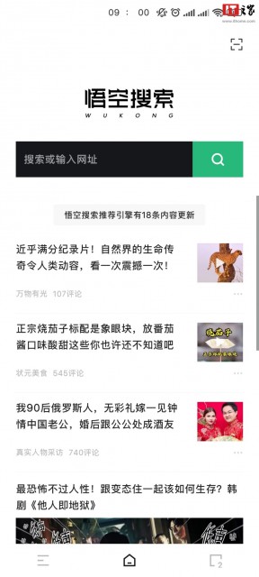 在实际体验中,悟空搜索 App 的整体感觉较为简洁。打开 App 后,默认为主页,在主页中间为黑绿撞色设计的搜索栏,上方为悟空搜索的中英文标识,下方为推荐的信息流,在右上角还可以进行二维码扫码。当用户开始浏览信息流信息时,悟空搜索标识将会淡出,搜索栏也会进一步简化,从而提升用户阅读体验。