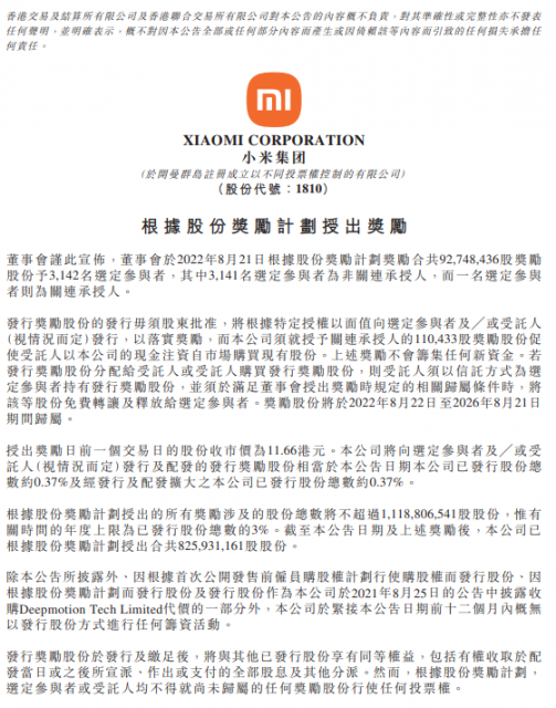 8月22日早间消息,小米集团公告,董事会于2022年8月21日根据股份奖励计划奖励合共9274。84万股奖励股份予3142名选定参与者,其中3141名选定参与者为非关连承授人,而一名选定参与者则为关连承授人。