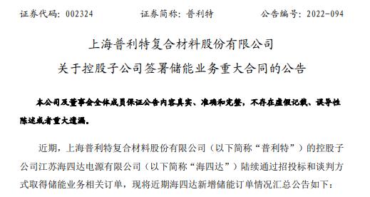 9月5日晚间,普利特(002324。SZ)发布《关于控股子公司签署储能业务重大合同的公告》称,公司控股子公司海四达陆续通过招投标和谈判方式取得储能业务相关订单,中标金额合计7。64亿元。