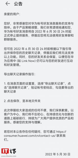 5 月 31 日消息,昨日,华为发布公告称,由于产品策略调整,华为账号好友消息将自 2022 年 6 月 30 日 24 时起正式停止提供服务,停服后用户将无法使用好友单聊和群聊服务。