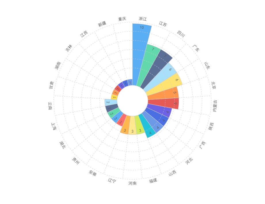 项目所在地区分布数量前五名依次为:浙江10项,江苏、四川个7项、山东、广东各6项、内蒙古、北京各5项,广西、山西、陕西、河北各4项。