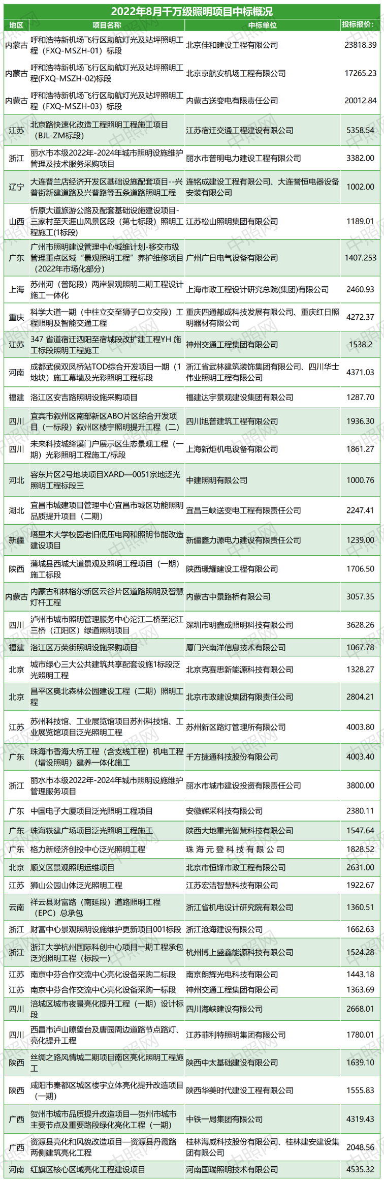 从中标的数量看,神州交通工程集团有限公司拿下《347省道宿迁泗阳至宿城段改扩建工程YH施工标段照明工程施工》、《南京中芬合作交流中心亮化设备采购一标段》《江山市城区亮化提升一期工程(三标段)》三项工程,为八月中标千万级照明工程最多的企业。