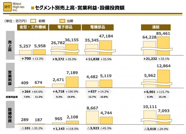 9月14日,日本Mitsui High-tec公司发布半年报(2022年2月1日-2022年7月31日),上半年该公司营业收入为854。61亿日元,同比增加33。1%,营业利润为128。64亿日元,同比增加115。7%。