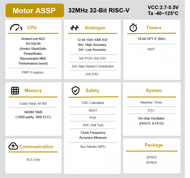瑞萨发布的全新RISC-V ASSP产品预编程了由独立设计公司(IDH)BFG Engineering和DigiPower(HK)Technology Ltd。开发的专业应用代码。BFG和DigiPower均在电机控制领域拥有丰富的专业知识和成熟的客户支持能力。其中,BFG以缩短客户电机启动时间的无传感器算法而闻名。DigiPower自2008年以来持续推出成本优化、可扩展的电机驱动解决方案,并设计了用于控制冰箱压缩机、风扇、泵等专用解决方案。BFG和DigiPower都将与客户合作完成最终设计并协助其方案过渡至生产。