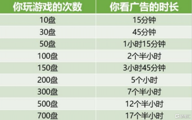 按照每局用复活、移格子、洗牌三个道具来算,平均得看90秒广告。这个数字并不夸张,但看下面这个广告时间对应表就震撼了。