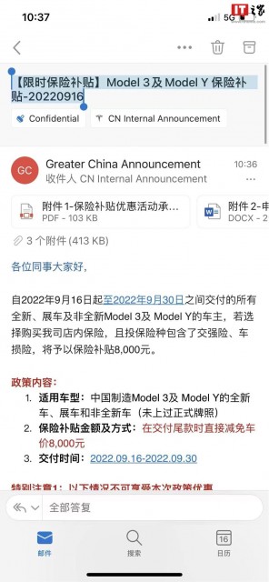 9 月 16 日消息,据特斯拉内部邮件显示,对于自 9 月 16 日到 9 月 30 日完成提车的车主,若选择在特斯拉店内购买保险,可享受 8000 元保险补贴,保险补贴可直接用于减免车价,澎湃新闻报道称特斯拉方面了解到消息属实。