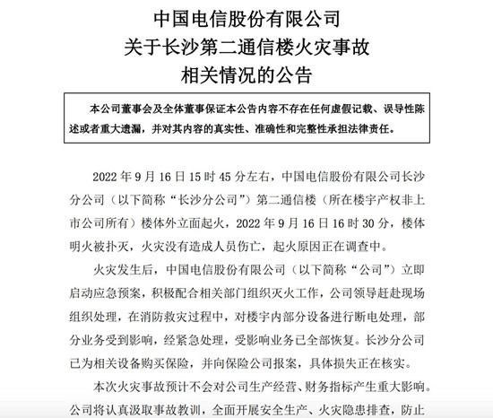中国电信称,起火原因正在中,长沙分公司已为相关设备购买保险,并向保险公司报案,具体损失正在核实。本次火灾事故预计不会对公司生产经营、财务指标产生重大影响。