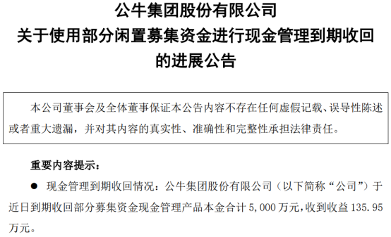 近期,公牛集团发布公告称,公司于近日到期收回部分募集资金现金管理产品本金合计5000万元,收到收益135.95万元。
