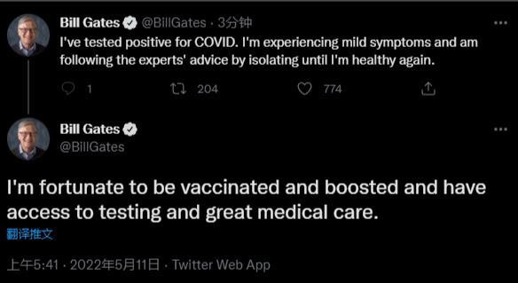 5 月 11 日消息,据央视报道,比尔・盖茨在今日在社交平台上表示,他的新冠检测结果呈阳性,而且此前他已经接种了新冠疫苗加强针。盖茨表示,他的新冠症状轻微,正在听从专家的建议进行隔离直到恢复。