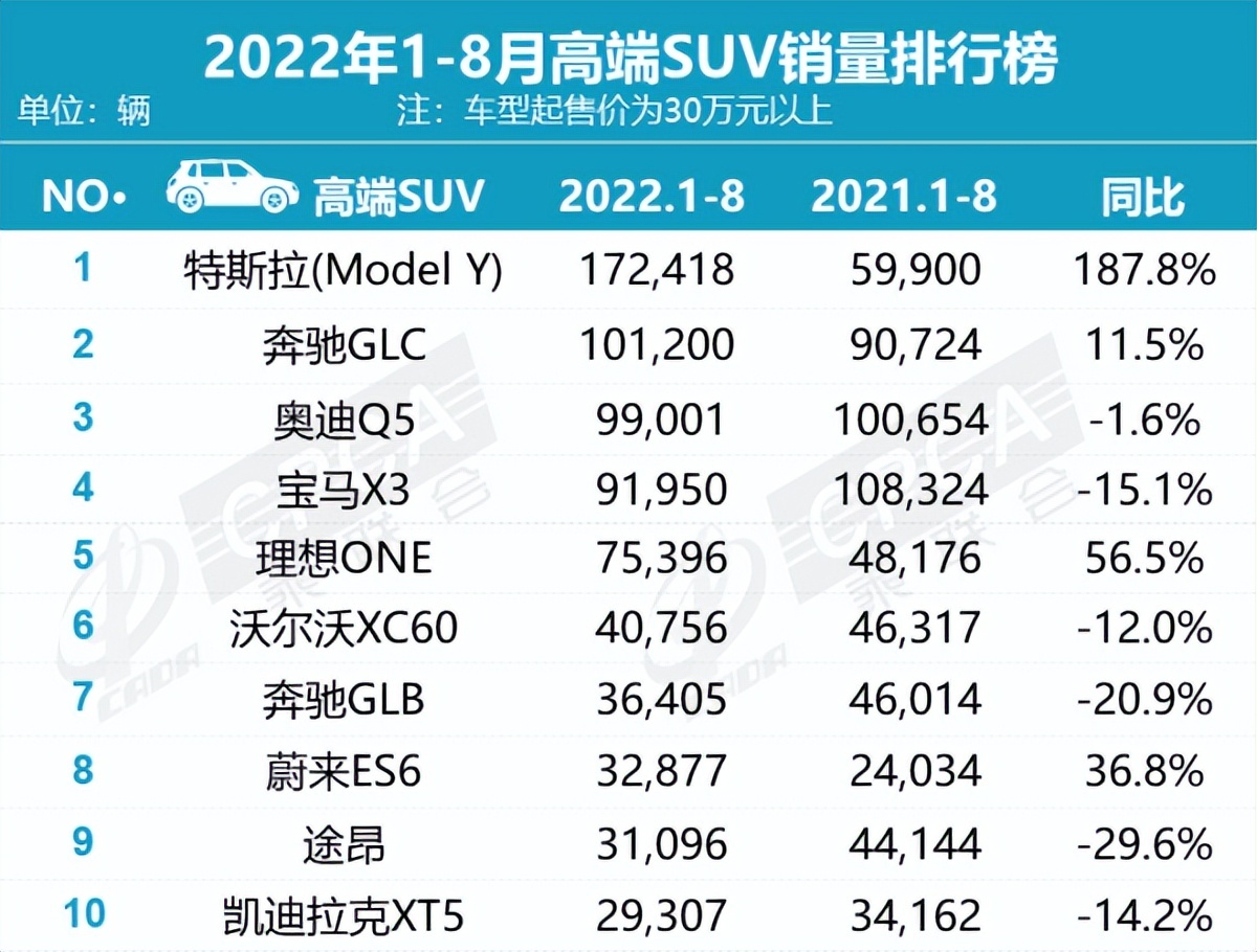 据乘联会最新公布的2022年前8个月高端SUV(起售价30万元以上)销量榜显示,即便是奔驰、奥迪与宝马这些老牌豪华车企的“扛把子”车型,销量也只在10万左右徘徊,也就是每个月1。25万,而“友商”理想的ONE销量还不到每月上万。