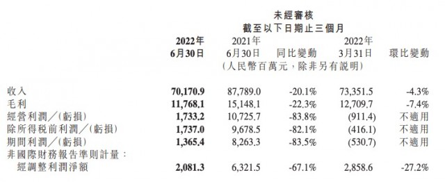 8月19日消息,小米集团发布截至2022年6月30日的第二季度财报。二季度小米集团营收701。7亿元,同比下滑20。1%;经营利润17。3亿元,同比下滑83。8%;期间利润13。7亿元,同比下滑83。5%;调整后净利润20。8亿元,同比下滑67。1%。