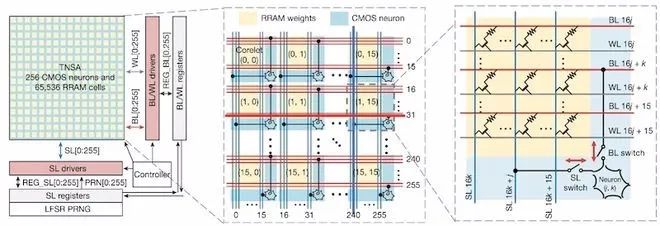 在NeurRRAM架构中,CMOS神经元电路与RRAM权重在物理上交错。