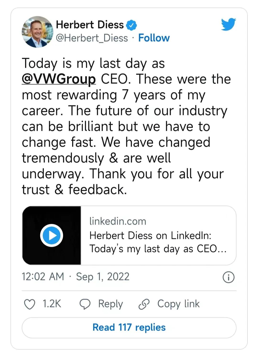 2022年8月31日,迪斯在大众汽车集团工作的最后一天。