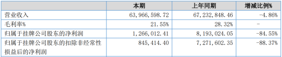 2022年上半年,公司实现营业收入6396.66万元,同比预减4.86%;归属于挂牌公司股东的净利润126.60万元,同比下降84.55%;归属于挂牌公司股东的扣除非经常性损益的净利润84.54万元,同比下降88.37%。